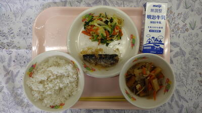 牛乳 麦入りごはん いわしの味噌煮 おひたし 五目きんぴら