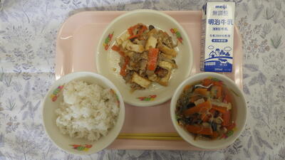 牛乳 麦入りごはん 生揚げと豚肉の豆板醤炒め 白菜スープ