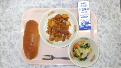 はちみつパン 牛乳 鶏肉とじゃがいものケチャップあえ