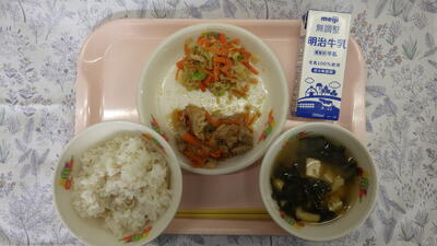 牛乳 麦入りごはん スタミナ焼き ごまあえ ほうれん草の味噌汁