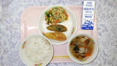 牛乳 麦入りごはん 笹かまぼこの二色揚げ さっぱりあえ