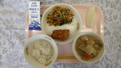 牛乳 麦入りごはん モロのから揚げ 大根のぽん酢あえ