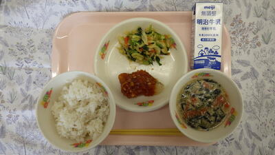 ・麦入りごはん 牛乳 鶏肉の漬けこみ焼き からしあえ