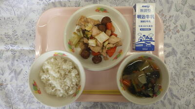 牛乳 麦入りごはん 焼き鳥風あえ物 根菜の味噌汁