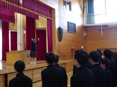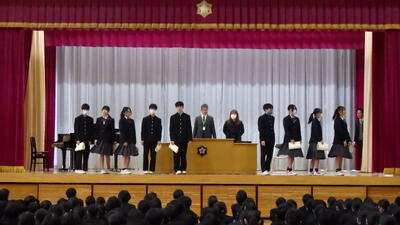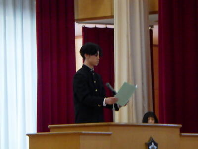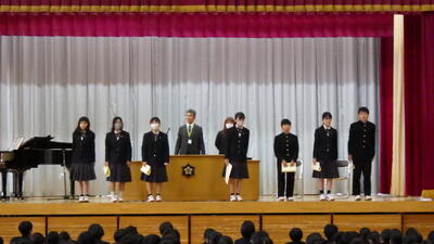 前半は、思い出深い「社会体験学習」と「スキー教室」の振り返り。生徒たちが自らの言葉で成果を語る姿に,集団としての絆の深まりを感じることができました。そして後半の立志式。 「志」を立てるという言葉の通り,代表生徒による作文発表や記念スライドからは,生徒たちの瑞々しい覚悟が伝わってきました。保護者の皆様,ご参観いただきありがとうございました。今後とも本校の教育活動へのご理解・ご協力をお願い申し上げます。