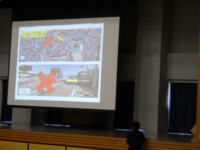 その後は、生徒会による交通安全教室が実施されました。学校の近くの危険個所の写真を見ながら登下校時の注意点を確認しました。