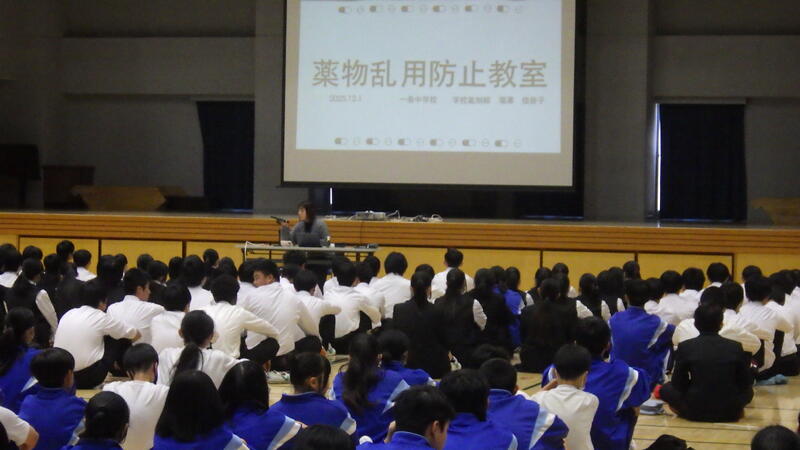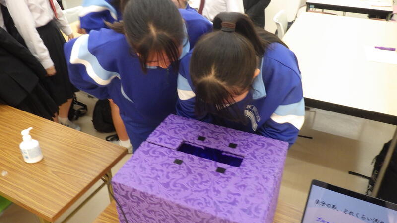 全校生徒がアリーナに集まりいつもお世話になっている薬剤師の先生から薬物乱用防止のご講和をいただきました。終了後、場所をランチルームにかえて「手洗い教室」です。石鹸で手を洗っても完璧にきれいになりにくいことを学びました。