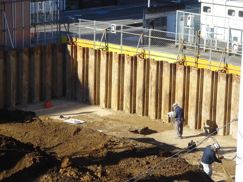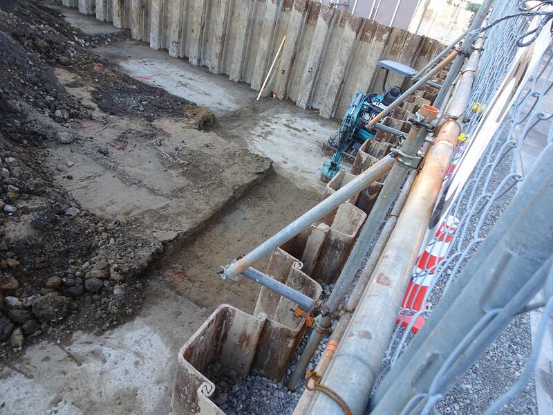 土を掘っていくと,地盤改良工事を行ったコンクリートの部分が見えてきました。