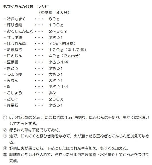 参考に写真と一緒に「もずくあんかけ丼」のレシピもお知らせしますので,ご家庭でもお試しください。