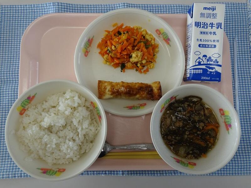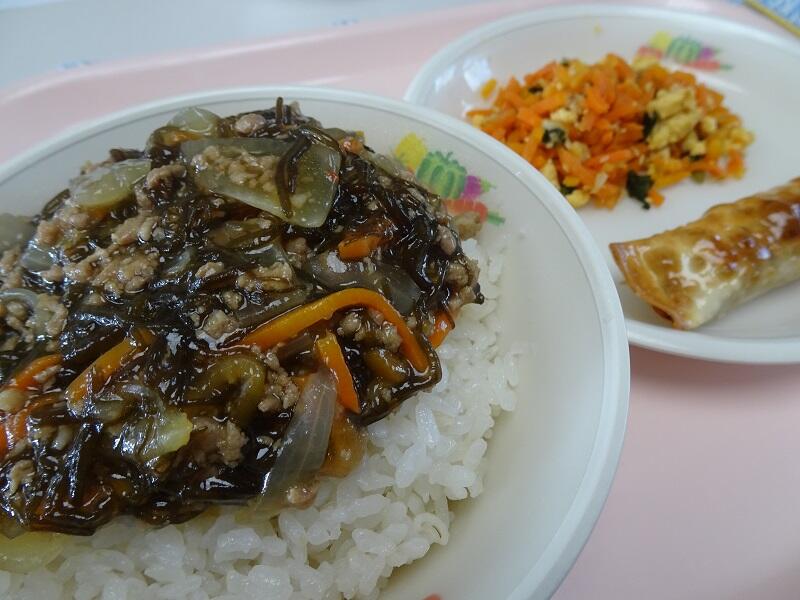 本校では,1月20日(火)に,うるま市の学校給食人気メニューのひとつの「もずくあんかけ丼」と「にんじんシリシリ」を提供しました。