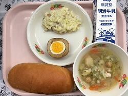 【絵本給食献立】麦入りご飯、牛乳、野菜炒め、豆腐入りかきたま汁、フィッシュビーンズ