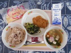 【卒業祝い献立】赤飯、牛乳、ヒレカツ、いそべあえ、お祝いすまし汁、クレープ