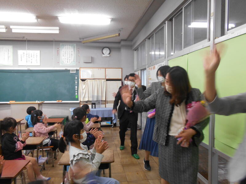 ▼離任式の後、離任される先生方が、各教室を歩いて回りました。子供たちは、笑顔と拍手で、これまでの感謝の気持ちを精一杯伝えていました。