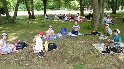▼益子の森で昼食です!みんなで楽しくいただきました。「お弁当、最高~!」
