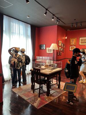猪苗代湖畔の野口英世記念館の見学中です。英世の生家や研究の道筋や苦労など、様々な展示物から学んでいます。英世のアンドロイドの話に耳を傾けていました。