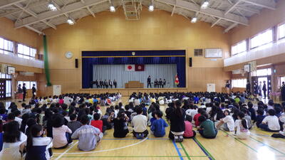 2年生から6年生の児童が体育館に集まり,離任式を行いました。