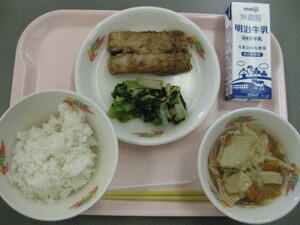 今日の給食:麦入りごはん 牛乳 さんまかば焼き おひたし せんべい汁(青森県の郷土料理)