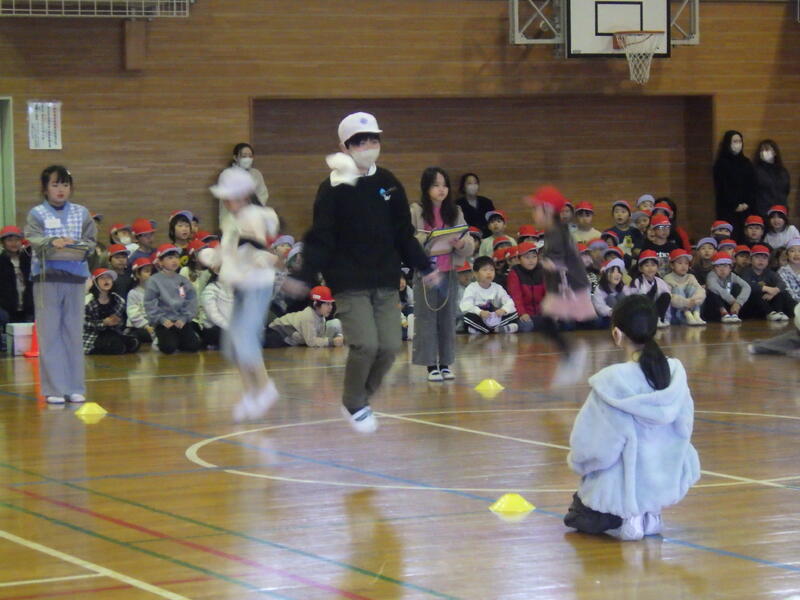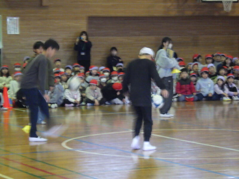 6年生と下級生がなわとびやリフティングで数を対決しました。