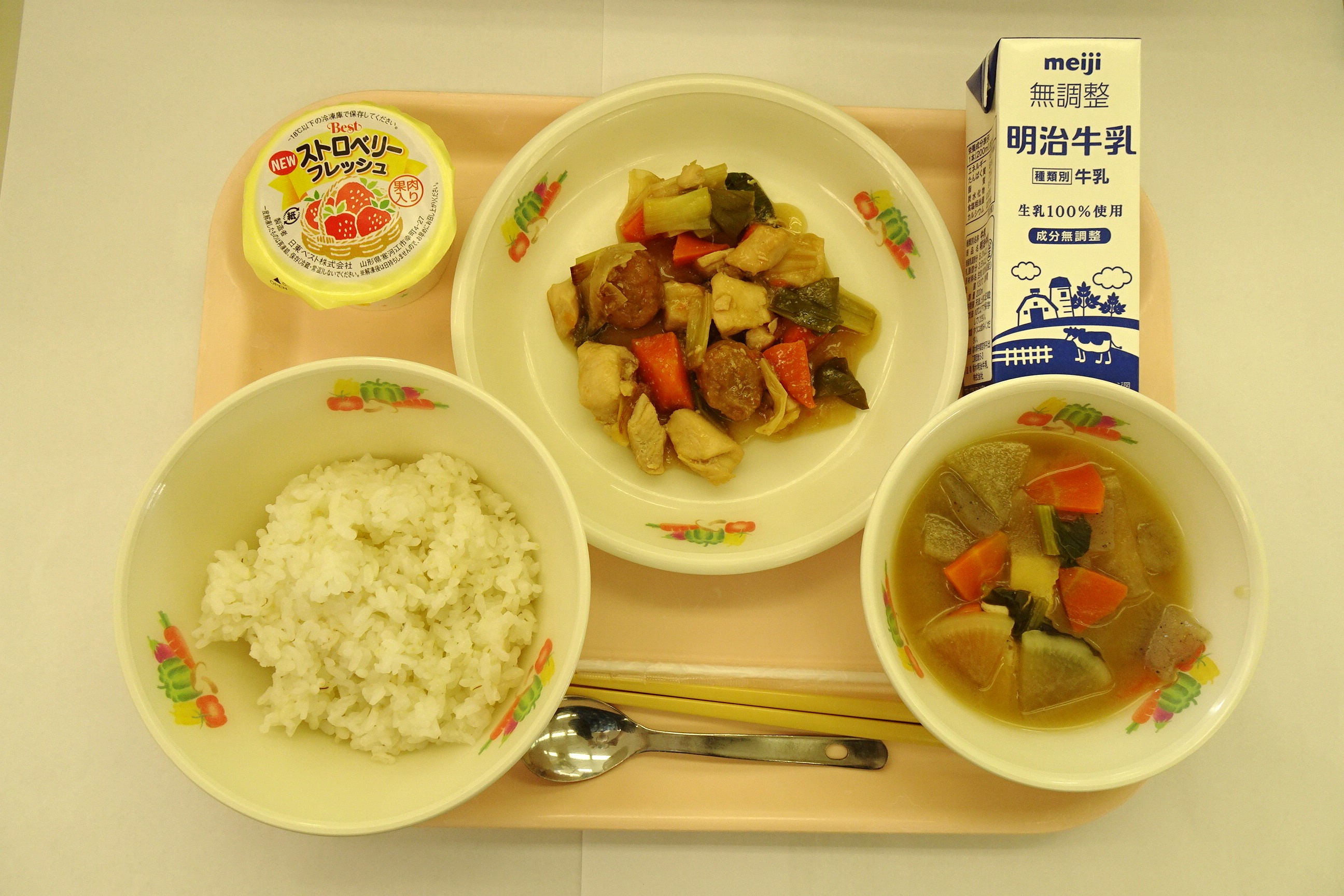 コッペパン 牛乳 いちごジャム ゆで野菜 とり肉のケチャップあえ 野菜スープ 今日のいちごジャムはとちあいかという品種のいちごから作られています。栃木県で2019年に初出荷された、新種のいちごです。名前は「とちぎのあいされるかじつ(栃木の愛される果実)」からきており、投票で決められたそうです。ジャムのつけ方を聞かれることがありますが、おすすめしているのはパンを一口ずつちぎって食べることです。ちぎったパンにジャムをぬって食べることで、見た目もきれいに、そして手も汚れることなく食べることができます。 |