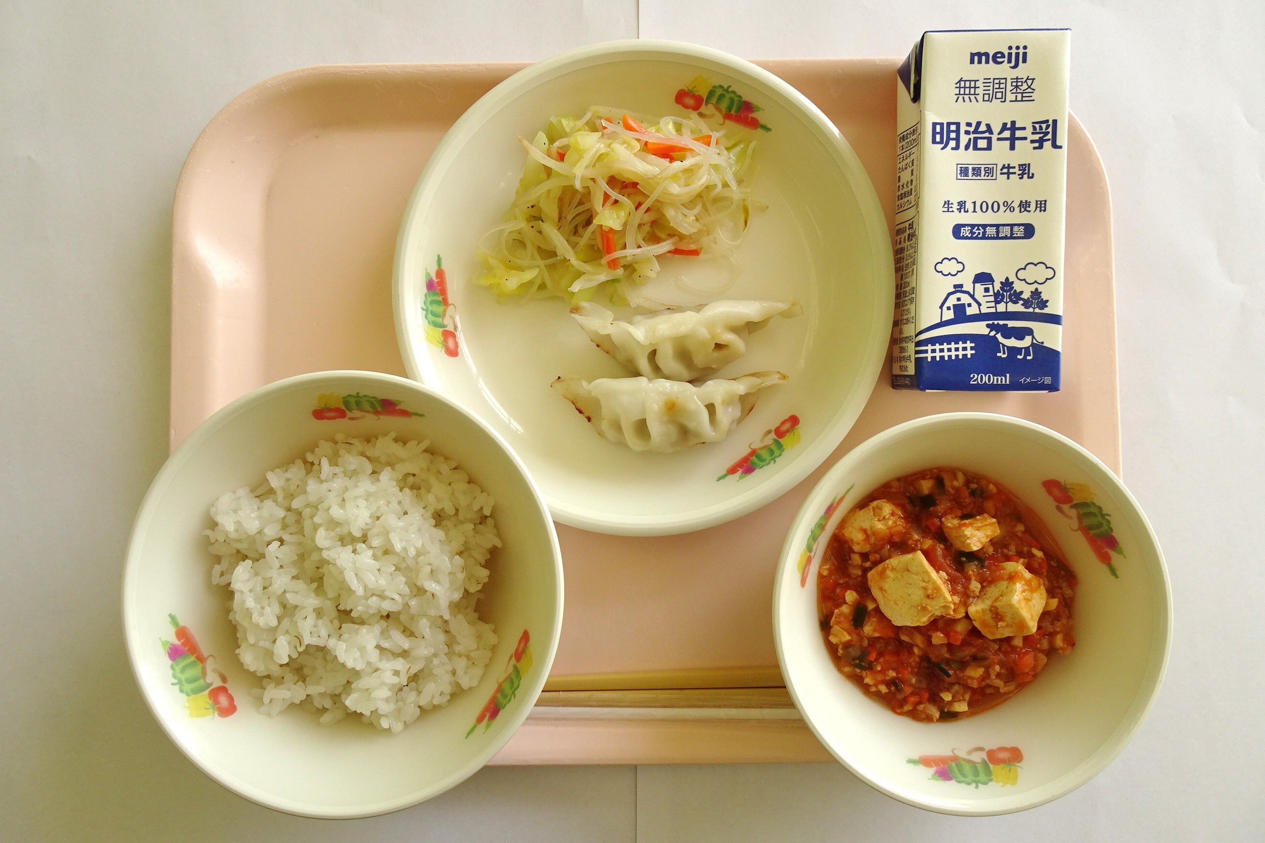 麦入りごはん 牛乳 ぎょうざ ゆで野菜 セルフトマトマーボー豆腐丼 今日はトマトが入った麻婆豆腐です。令和6年度のトマト料理コンクール入賞作「激ウマ!!トマト麻婆豆腐」を参考にしています。真っ赤なマーボー豆腐に「辛そう・・・」と不安になる児童もいましたが、うまみたっぷり、おいしくいただきました。トマトはグルタミン酸といううまみ成分が多い野菜のひとつ。グルタミン酸は昆布などに含まれていることで有名ですが、みそやしょうゆなどの発酵食品にも多く含まれます。 |