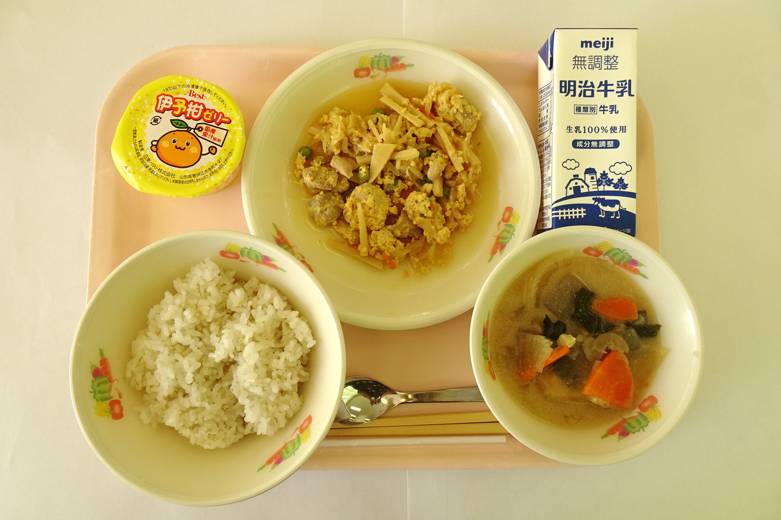 麦入りごはん 牛乳 白身魚のチリソースがけ ナムル ひじきと卵のスープ 片栗粉でまぶし、からっと揚げたお魚にチリソースをかけました。衣がぱりぱりしていて、食感を楽しむことができました。今日から宮っ子チャレンジウィークで中学生が給食の時間、小学生の配膳や片付けを手伝ってくれています。 |