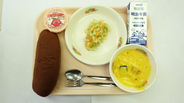 麦入りごはん 牛乳 ゆでやさい かぼちゃのカレー 型抜きチーズ 今日は、おはなし給食です。「あの本に出てくる料理だ!」「どんな味がするんだろう?」と、わくわくしながら給食を食べてもらえたら嬉しいです。その本も読んでみたくなったら、ぜひ図書室でさがしてみてくださいね。今日は「たまごからうま」という本に出てくる「かぼちゃ」にちなんだかぼちゃのカレーです。 |