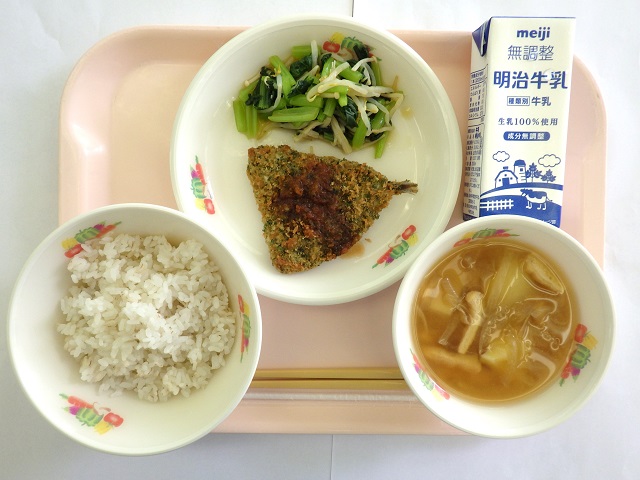 今日の煮魚はいわしです。新鮮なまいわしをしそと梅で作ったしょうゆだれで味がついており、骨までやわらかく食べられます。梅やしそが苦手でもおいしく食べられますよ。さて、今日はいわしに関するクイズです。いわしは、海の中で危険を感じるとあるめずらしい行動をとります。①からだのもようを変える②うろこをはがす③くっついて泳ぐ 3つのうちどれでしょう。(給食時間の放送で答えを伝えました。)
