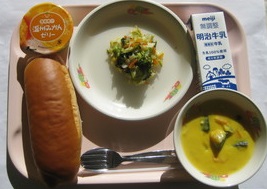 今日の給食:はちみつパン 牛乳 かぼちゃのシチュー 野菜ソテー みかんゼリー きゅうしょくポストに4年生から「なぜ先生のパンは袋に入っているの?」という質問が入っていました。 給食の量は発達段階に応じて違っています。必要なエネルギーや栄養の量は年齢や体格で違っています。先生のパンは5・6年生と同じ大きさにしているため,1年生から4年生の担任の先生の分はわかるように袋に入れています。 本日使用したブロッコリー(小山市産)を14日(水)に放射性物質検査したところ,放射性ヨウ素,放射性セシウムともに,定量下限値未満でした。 |