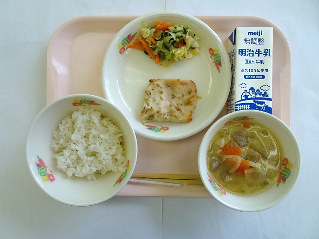 麦入りごはん 牛乳 チキンカレー フルーツポンチ 今日は1年生にとって初めての学校給食です。給食ではいろいろな食べ物が登場します。中には苦手なものもあるかもしれませんが,食べ物に感謝をしていただきましょう。 |