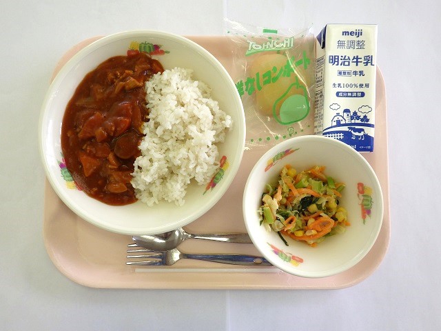 【今日の給食】 麦入りごはん 牛乳 かいそうサラダ チキンカレー ヨーグルト 【なぜ給食は麦入りごはんなの?】 給食のお米は,宇都宮市産100%のコシヒカリを使用しています。麦を混ぜて食物繊維やビタミンをより摂取できるようにしています。 |
