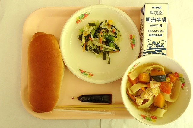 はちみつパン 牛乳 海そうサラダ ほうとう ミルメーク 今日(きょう)のミルメークは、牛乳(ぎゅうにゅう)に味(あじ)をつけるもとです。ミルメークをストローぐちに差(さ)し込(こ)み、味(あじ)をつけます。少(すこ)し飲(の)んでからでないとあふれてしまうので、注意(ちゅうい)してください。給食(きゅうしょく)ポストにリクエストされていました。4-3さんから「私(わたし)は牛乳(ぎゅうにゅう)がきらいなのですが、お母(かあ)さんからミルメークのことをきいて、それなら牛乳(ぎゅうにゅう)をおいしくのめるとおもいました。牛乳(ぎゅうにゅう)がすきではないひとも、すきなひともみんなおいしくのめると思(おも)ったから、リクエストをしました。」というリクエストメッセージがそえられていました。たしかに、牛乳(ぎゅうにゅう)が飲(の)めない人にとってミルメークがあることで飲(の)めるようになり、ふだんの牛乳(ぎゅうにゅう)にもチャレンジできるようになれば、うれしいです。 |