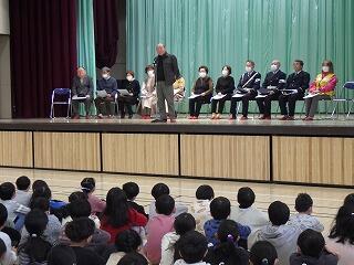 音楽朝会で体育館に全児童が集まり,城東小学校に感謝の気持ちを込めて,