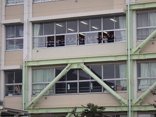 校庭に出て,大空高く凧揚げを楽しみました。