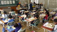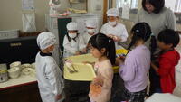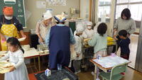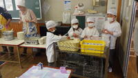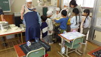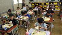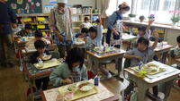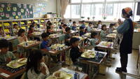 1年生が初めての給食を食べました。メニューは,ハヤシライス・ゆでやさい・お祝いいちごゼリーでした。みんなおいしそうに食べ,量を増やす子供もいました。
