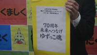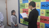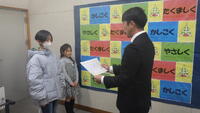 来年度の創立70周年に向けて,マスコットキャラクターとキャッチフレーズを募集したところ,多数のすばらしい作品が集まりました。その中から,マスコットキャラクターは,6年生の作品「ゆずぼん」,キャッチフレーズ,3年生の作品「70周年 未来へつなげ ゆずっこ魂」の作品が選ばれました。2月20日に表彰の様子を撮影し,本日,発表しました。