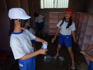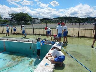 6年生がプール清掃を行いました。プールサイドやオーバーフロー,トイレ,更衣室などを,みんなで分担して清掃しました。それぞれが担当の仕事を黙々とこなし,プールがとてもきれいになりました。プール開きは6月3日になります。プールの時間が楽しみですね。