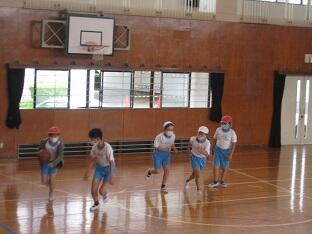 この日は雨なので,体育館で「ザ チャレンジ2022」個人走の練習です。