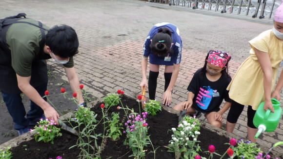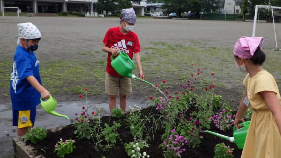 7月7日、飼育園芸委員会の児童が、南門の花壇に花を植えました。