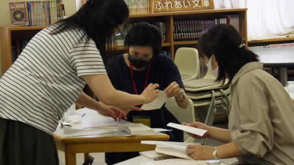 壊れた本の修理方法について説明を聞き,実際に図書室の本を修理してくださいました。何度も借りられて壊れてしまった人気の本が復活し,子どもたちも大喜びです。
