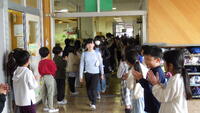 在校生の間を歩く6年生は、少し照れくさそうな表情でした。