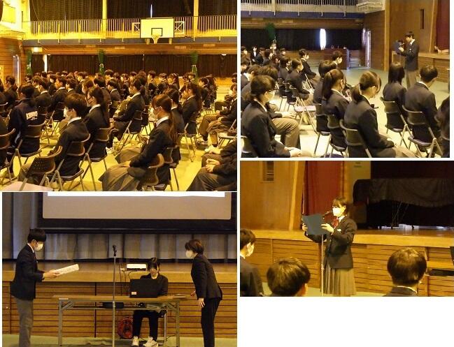 2月6日(金)に第2学年が立志式を行いました。実行委員の話、校長式辞、知事メッセージの後に、各クラスから誓いの言葉が発表されました。また、生徒代表として、4名の生徒が立志作文を読み、記念品が贈呈されました。その後学級で、保護者からの手紙を読み、多くの生徒たちが涙するなど、良い時間を過ごしました。