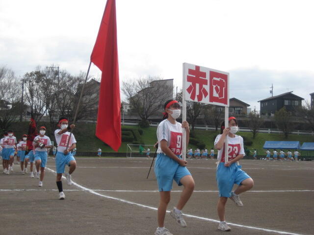 例年よりも縮小しての取組になりましたが,大会がなくなってしまった3年生のために,部活動行進・リレーが加わりました。最終種目の色別対抗リレー,そして閉会式まで団長,3年生のリーダーシップのもと,最後まで元気に取り組みました。結果は,優勝・青団,準優勝・緑団,3位・黄団,4位・赤団でした。成績発表のときに優勝・準優勝チームが喜びで騒ぐことなく,淡々と受け入れていました。このように,相手チームのことを思いやり,冷静に対応できたことも,今日の成功に繋がったと思います。涙を流す3年生も多数いて感動的な運動会になりました。