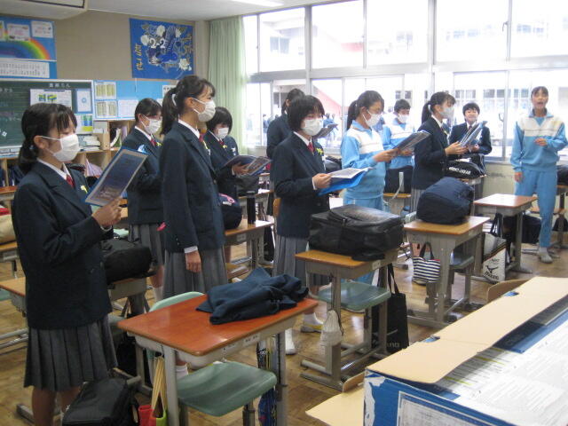 また,後半の時間に3学年合唱発表会を行いました。保護者の皆様には,来週の合唱コンクールを参観していただくことはできませんが,今回は,生徒がマウスシールドを着用して歌うこと,座席前後の間隔を十分にとること,換気をすること,検温,消毒のご協力をいただくことで実現できました。本番1週間前の発表でしたが,どのクラスも完成度の高い歌声を発表していました。
