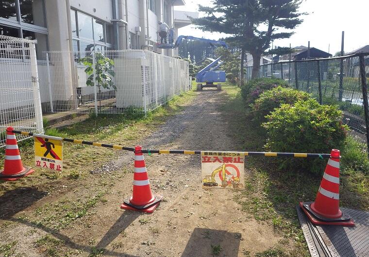 体育館空調施設の7月利用開始に向けて,工事が始まりました。13日(木)に資材が搬入され,14日(金)そして本日,電気関係の工事が行われました。
