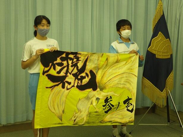 学級旗については,それぞれのクラスから思いを込めて作られていることが紹介されました。続いて,各団の団長から決意の一言がありました。