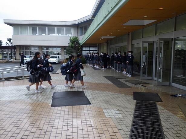 毎月1日(月初め)の『かわちあいさつの日』にあわせて,河内地域学校園(岡本小,岡本西小,河内中)であいさつ運動を行っています。生徒会役員を中心とした担当の生徒たちが昇降口に立って,登校してきた生徒たちに元気にあいさつをしていました。