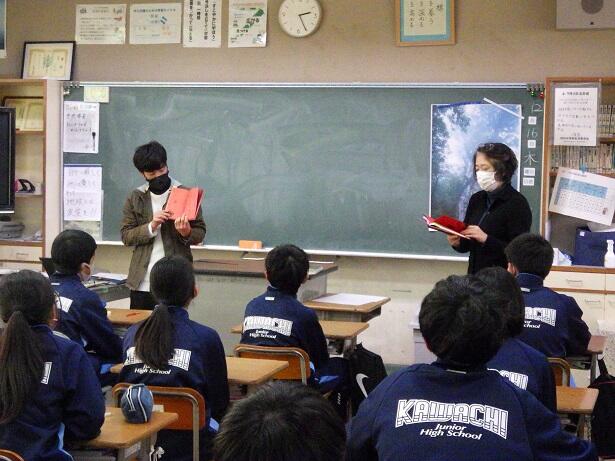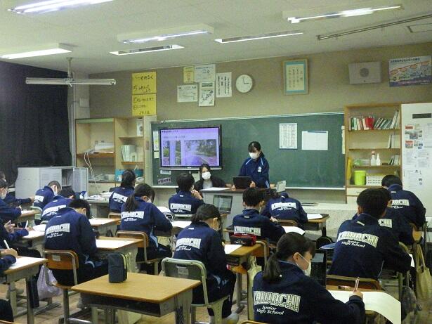 本日の6校時,1年2組において,司書の先生が入って学級担任とTTによる道徳の授業を行いました。司書の先生によるブックトークも織り交ぜながら,自然との共生について,またSDGsの気候変動と私たちの生活とを関連させて考えることができました。
