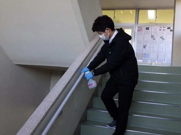 スクールサポートスタッフの斎藤壮一郎先生には,2学期初めから週に3日,校内の消毒作業を中心に活動していただいています。また,校舎内をまわりながらも,気軽に生徒たちに気軽に声をかけてくださっています。今は,階段の手すりや美術室の机,体育で使用したグローブ,ボール,バットの消毒作業等をお願いしています。