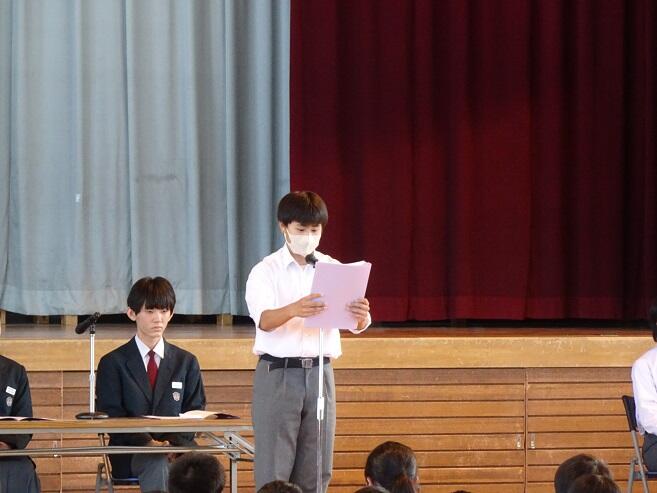 今日の6校時、体育館において前期生徒総会を行いました。今年度の活動計画について、生徒会本部、各専門委員会から説明がありました。その後、予算が承認され、いよいよ本格的に生徒会活動が始まります。すべての生徒がそれぞれの立場で関わり、生徒会活動を盛り上げていってください。