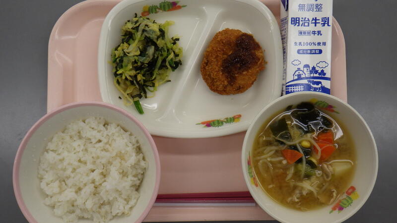麦入りごはん 牛乳 メンチカツ 磯辺あえ どさん子汁